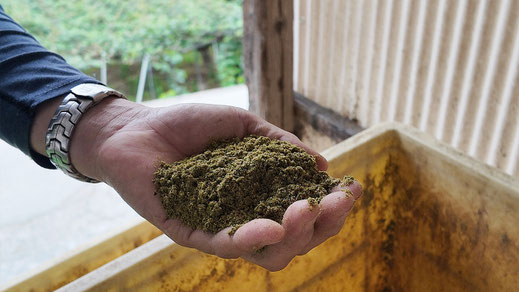 特に力をいれているのは独自配合の発酵飼料です。地元のお豆腐屋さんのおからや米糠、醤油粕を発酵乾燥させ飼料に添加しています。
