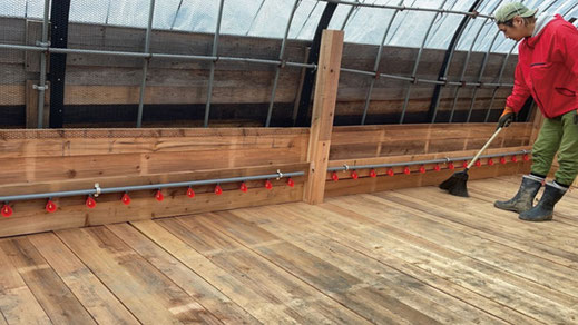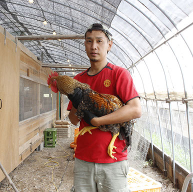 久万清流米にも使用されている仁淀川水系の『永氏川』(えいしがわ)水を引いて与えています。また地面からの細菌に鶏が触れないよう高床式ウッドデッキ仕様の鶏舎にすることで風通しのよい環境を整えています。地元久万高原町で確保したもみ殻をふんだんに敷き詰め、地元の木材で建設された鶏舎は鶏のストレスフリーを実現する環境です。配合飼料に地元の野菜や米ぬかをまぜ、工夫しています。